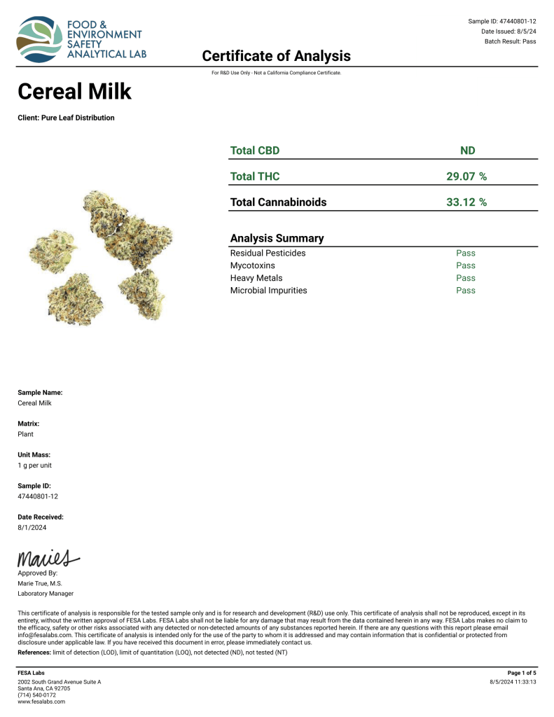 Cereal Milk delivers a potent experience with its high THC content of 29.07%. Users typically report an initially uplifting sensation that gradually transitions into deep relaxation. The strain’s effects are characterized by a balanced hybrid profile, making it suitable for both daytime and evening use. While most users report positive experiences with stress and anxiety relief, some may experience dry mouth or occasional anxiety with higher doses.