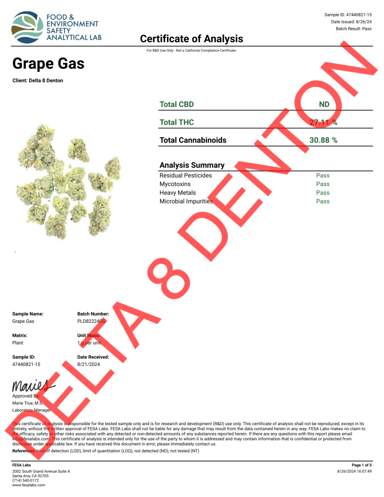 Grape Gas offers a potent experience with its high THC content of 27.11%. Users often report feeling relaxed and euphoric, with an uplifting sensation. The strain’s effects are described as balanced, making it suitable for afternoon or early evening use. While it provides relaxation, it may also offer a slight energizing quality. Some users may experience dry mouth and dry eyes as common side effects. The strain’s complex flavor profile, combining grape and diesel notes, adds to its appeal for cannabis connoisseurs.