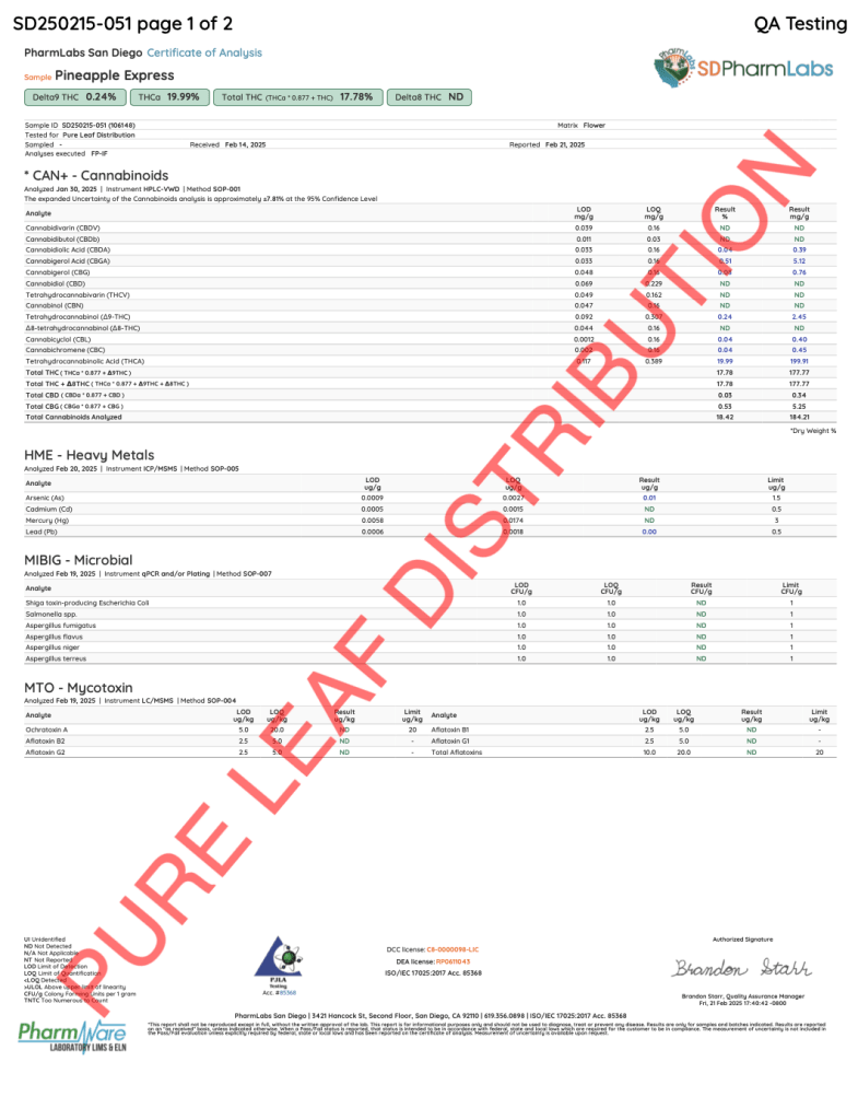 Pineapple Express features a rich terpene profile dominated by myrcene, which contributes to its earthy aroma and potential calming effects. Supporting terpenes include caryophyllene, offering spicy notes and potential anti-inflammatory properties, and pinene, providing fresh pine scents and potentially enhancing alertness and memory.
