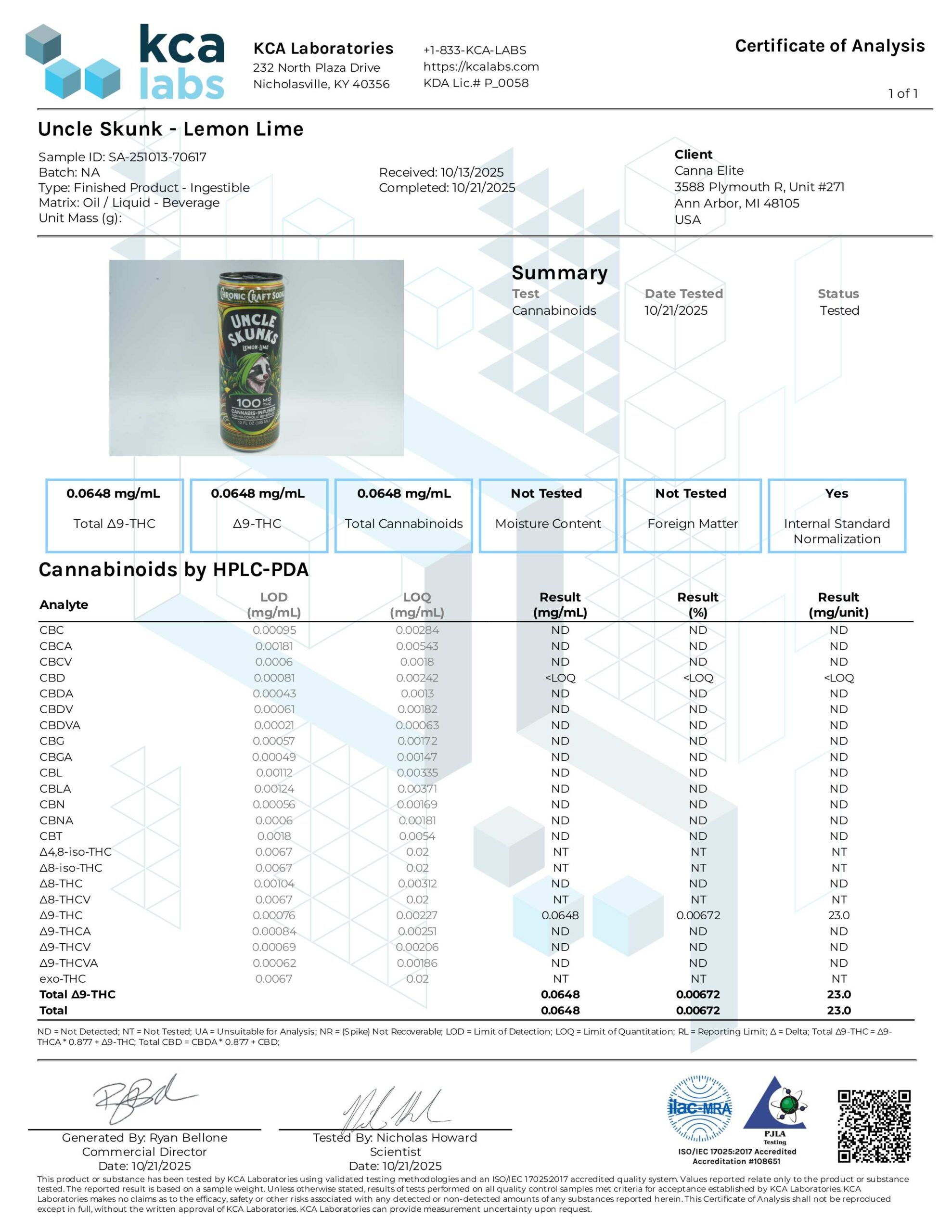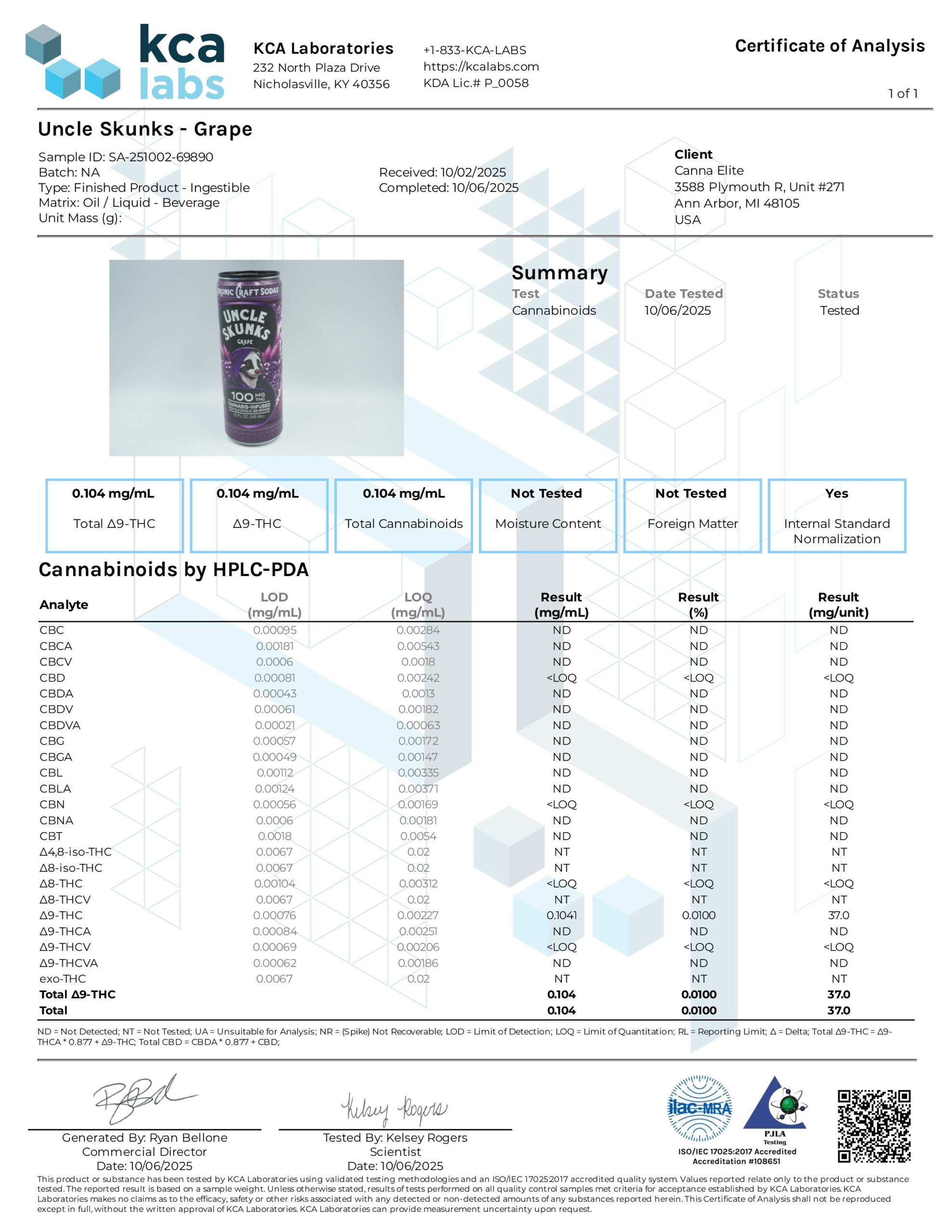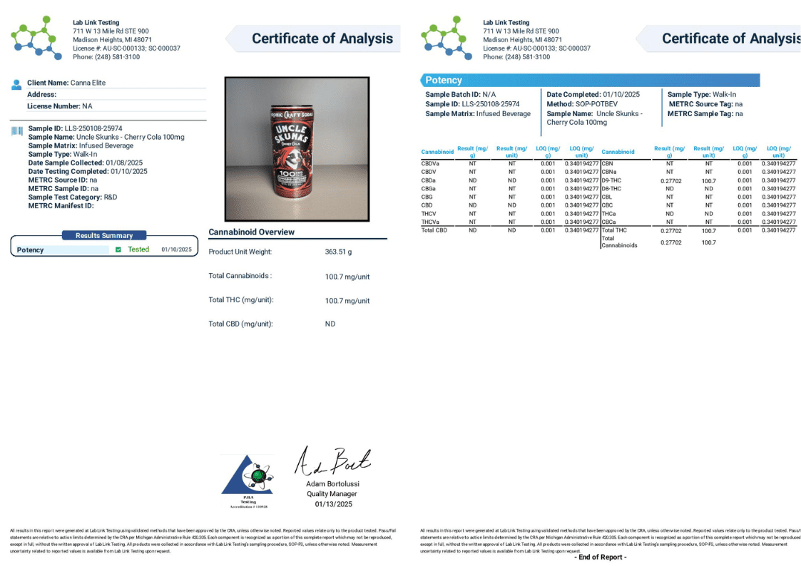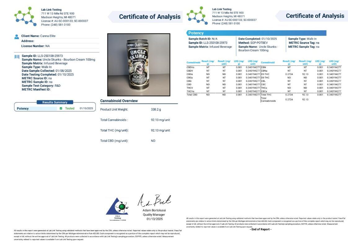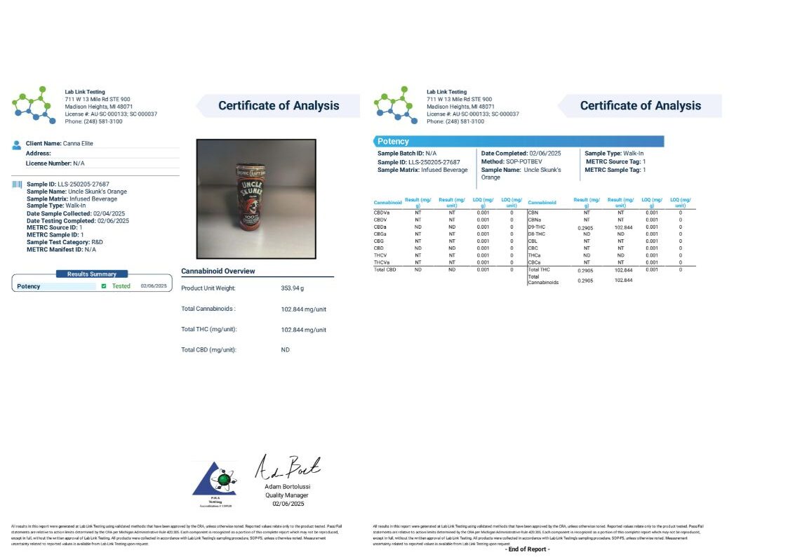 Expert Craftsmanship: Developed by CannaElite, known for their attention to detail and commitment to quality, each bottle is a testament to their dedication to excellence in both flavor and effects. Uncle Skunks brings together premium ingredients with precise infusion techniques for an unmatched beverage experience.