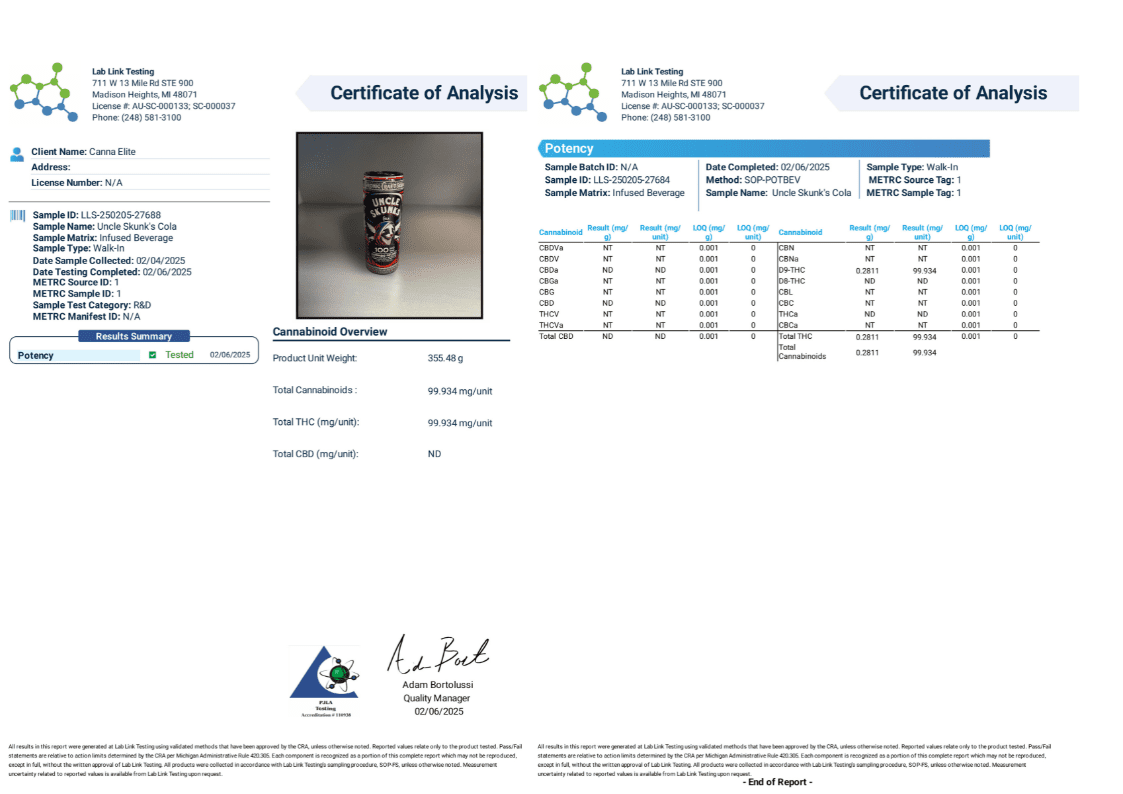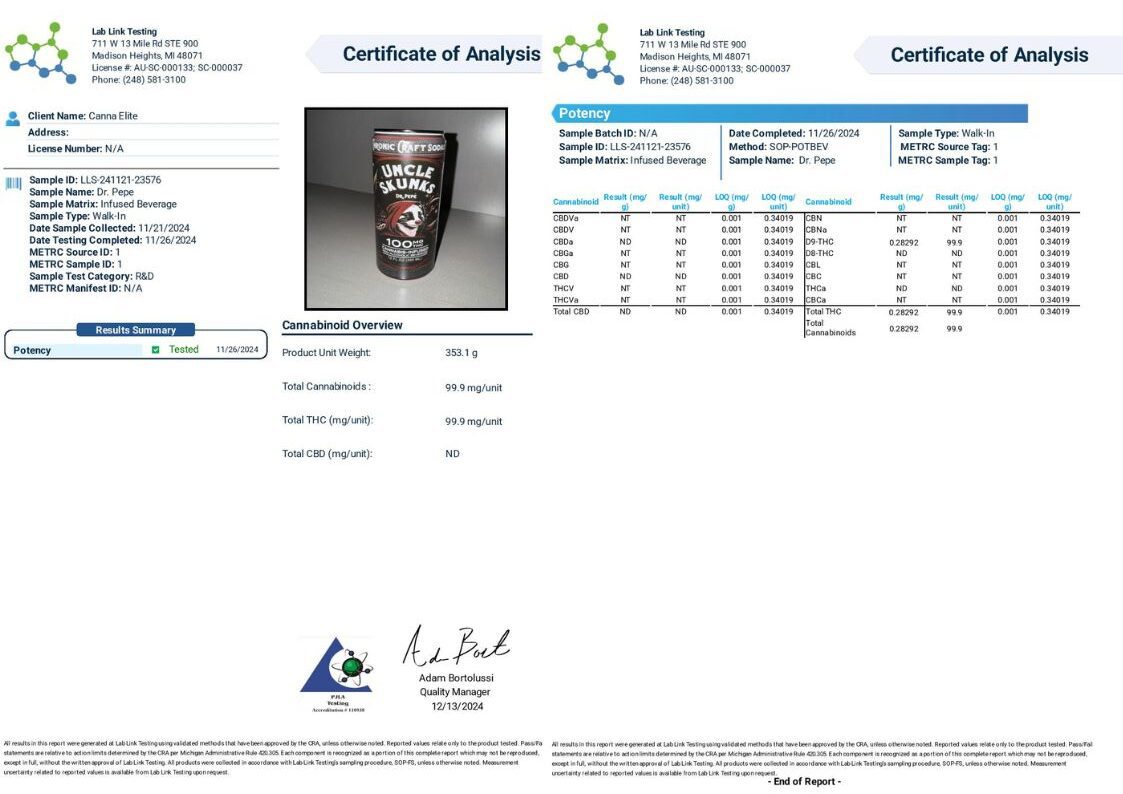 Every batch of Uncle Skunks Chronic Craft Soda undergoes rigorous quality control and third-party testing to ensure consistency, purity, and potency. Our strict quality assurance processes guarantee that each bottle meets the highest standards for both taste and effects.