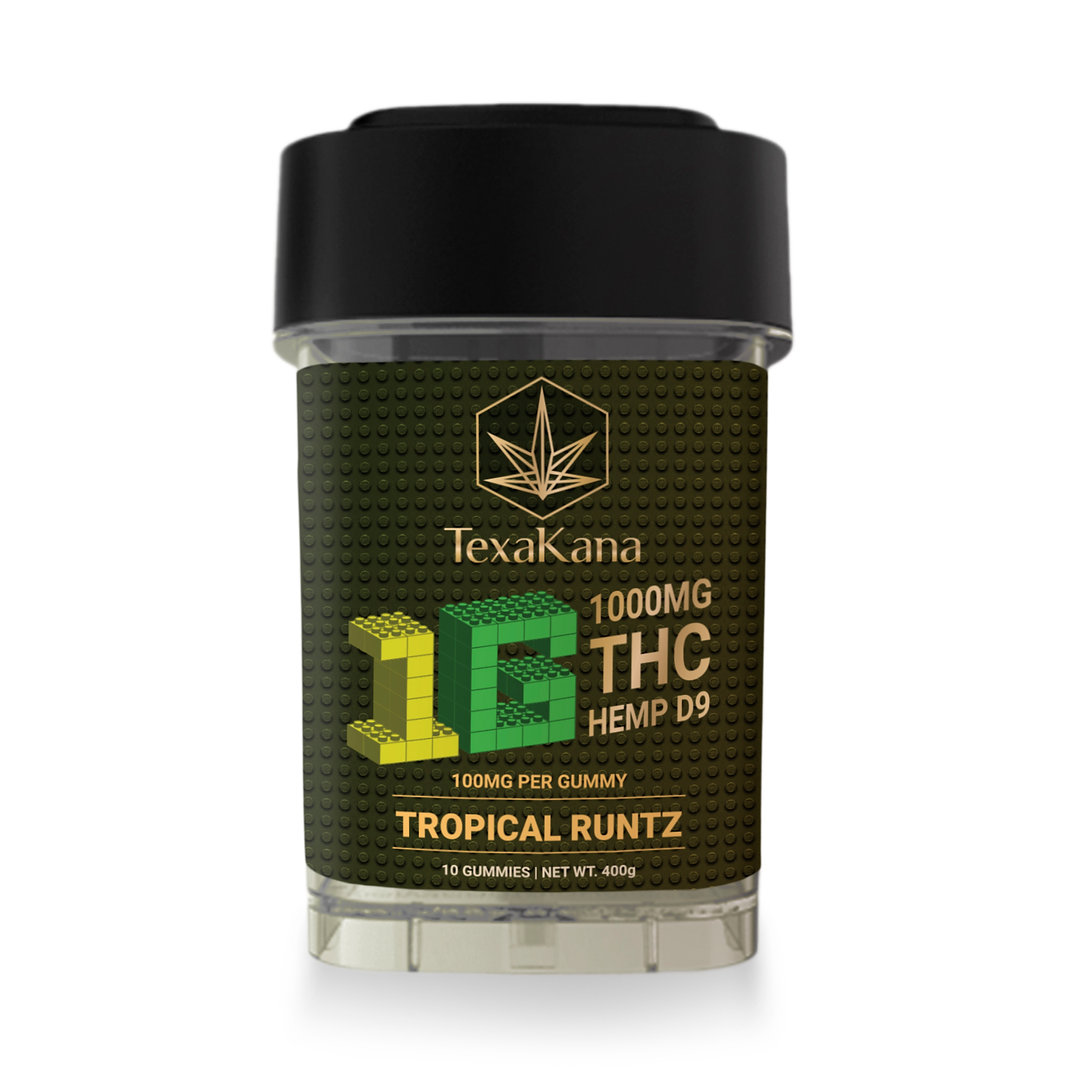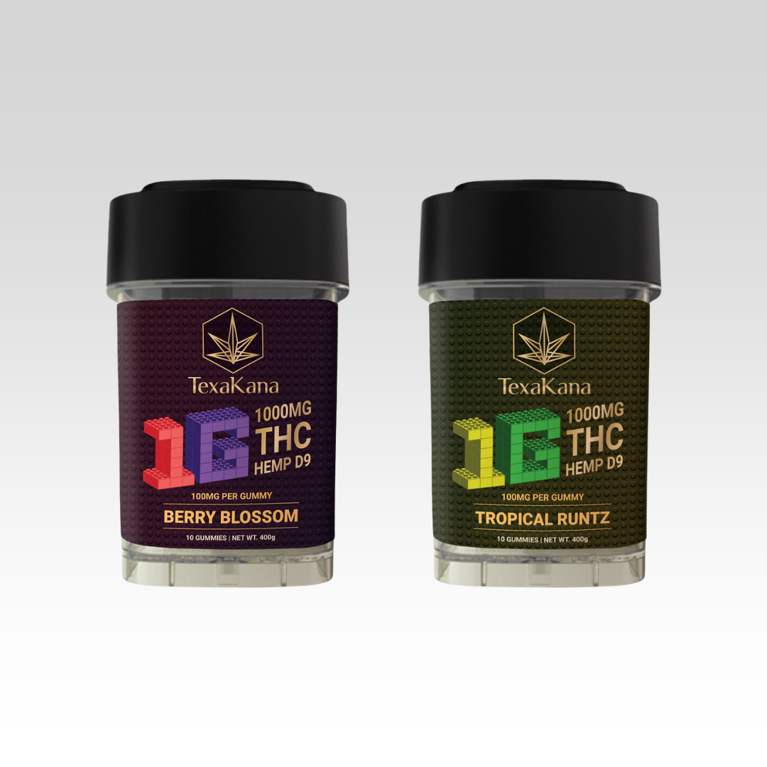 The Texakana Delta 9 THC 1G Gummies pack 1000mg of nano-emulsified hemp-derived Delta 9 THC into a jar of 10 gummies at 100mg each. These are not starter edibles. Each gummy also contains hemp-derived CBD alongside the Delta 9 THC, and the recommended serving size is 1/8 of a gummy (12.5mg) so you can dial in exactly where you want to be. Made with pectin, natural flavors, and natural colors. Available in two flavors. If you are looking for Delta 9 THC gummies in Denton with serious potency, this is the top shelf. Available for in-store pickup and edible delivery in Denton.